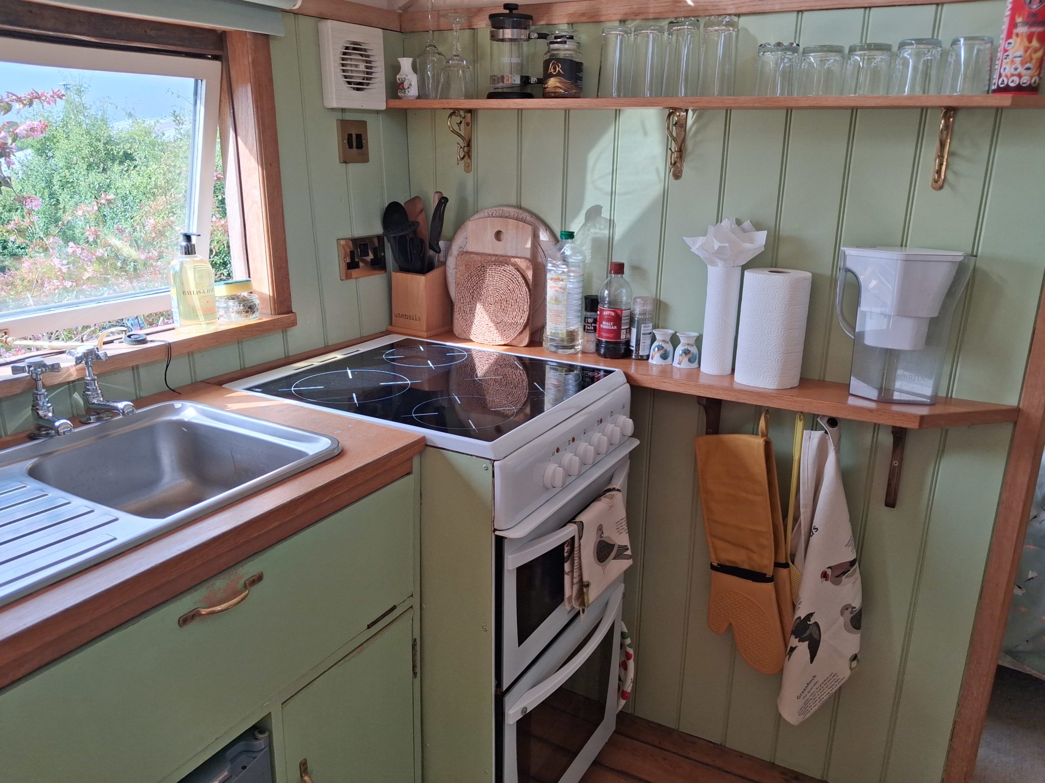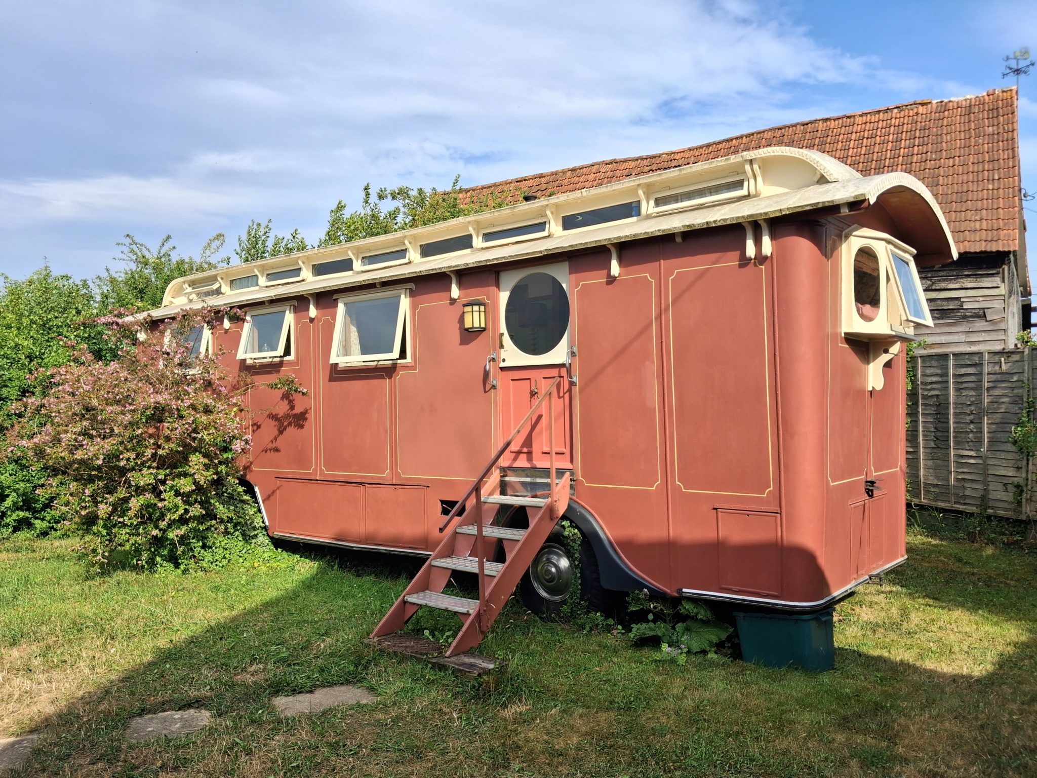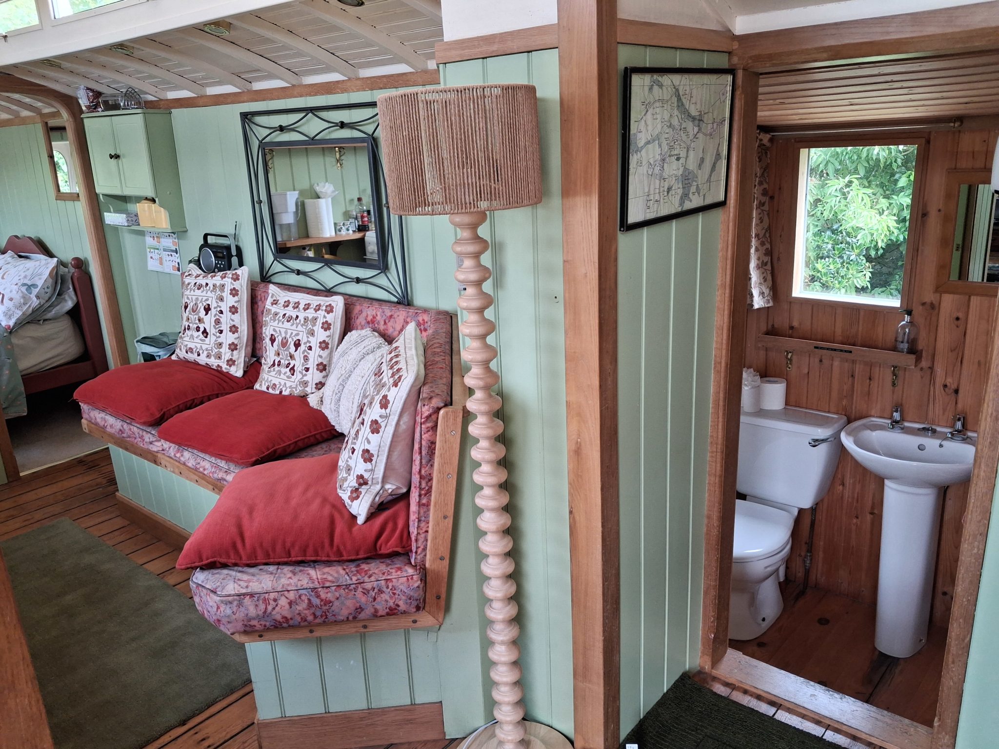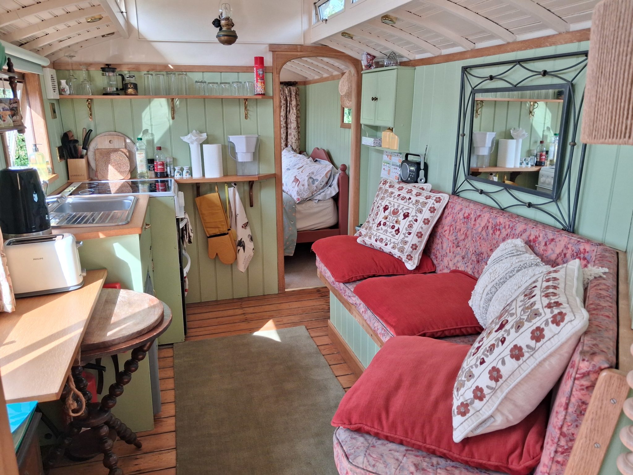 The showmen of the past would love what we’ve done with the place! While still distinctly a showman’s wagon, it has all the mod-cons you’d expect from a modern holiday let. The centre of the wagon is the living and dining area, with wrap-around bench seating and a fully-equipped kitchenette. There is a small TV and radio in this sitting/dining area.