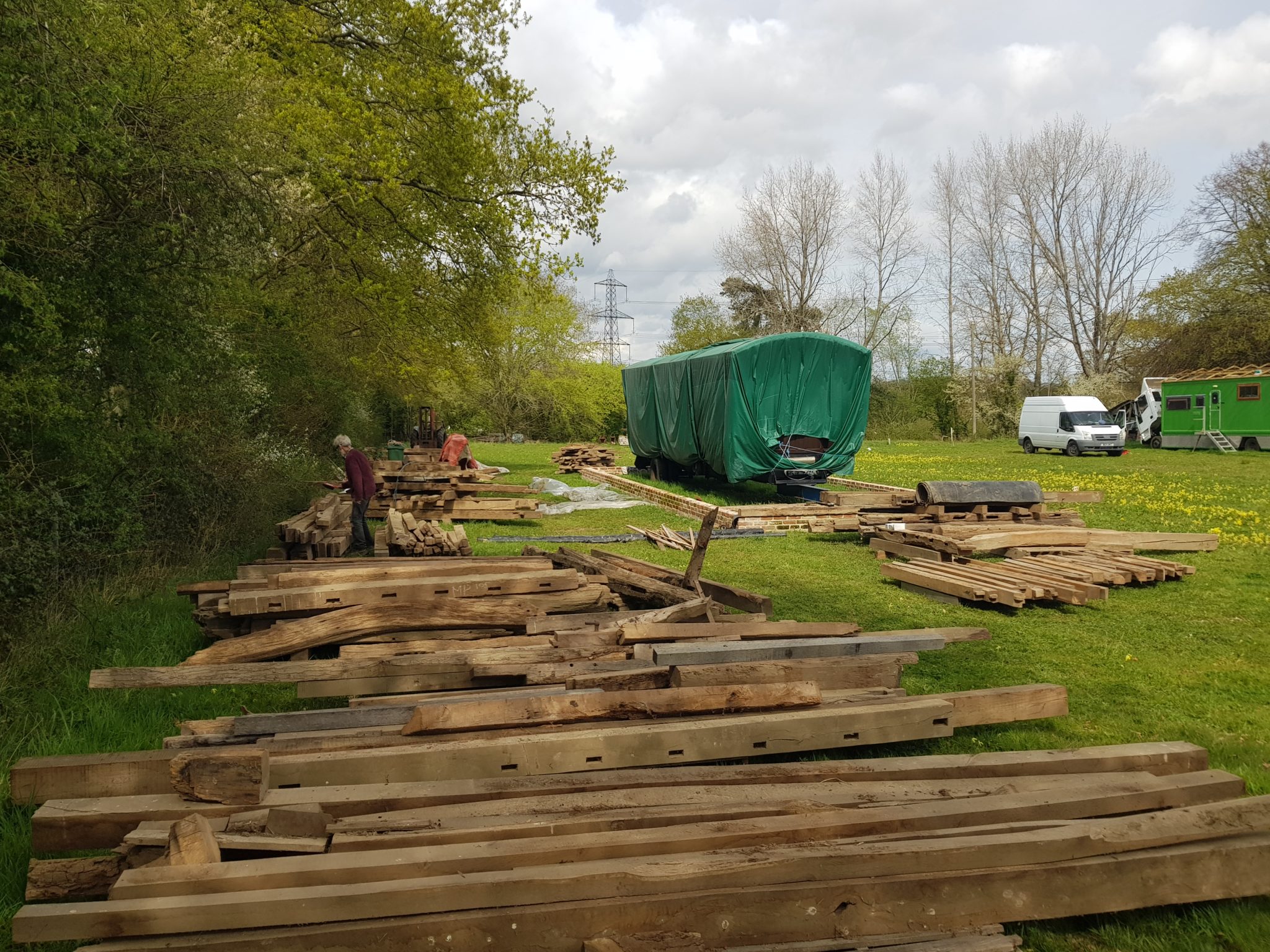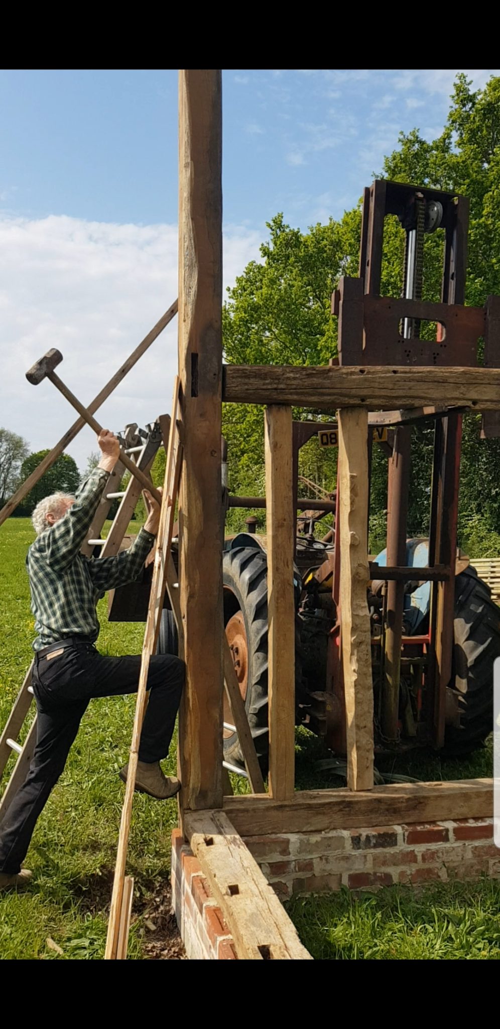 Maudies Carriage is now situated on our Montagues Farm site. Restoration is in progress! Currently the ancient barn frame that will house the Carriage is being re-constructed piece by piece. When the Ancient Essex Barn originally blew down in 1987 John had the foresight to label each piece and outline them on drawings ready for the day when it could be rebuilt. John and son Ben have been looking forward to this project and are hard at work on construction this summer.