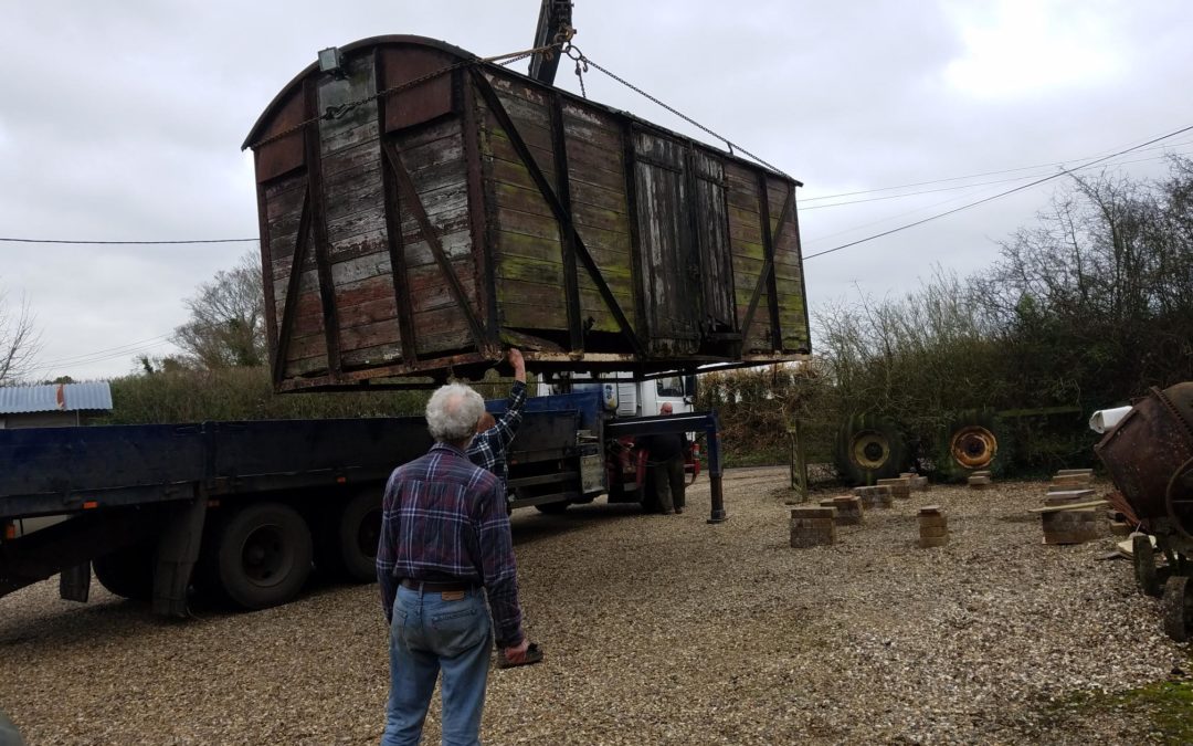 https://www.coppinsfarm.co.uk/wp-content/uploads/2019/03/carriage3arrives.mp4 Our latest addition arrived today and is temporarily resting on a trailer in the meadow. We won’t be starting renovation just yet as the workshop is busy with Maudie’s Carriage....