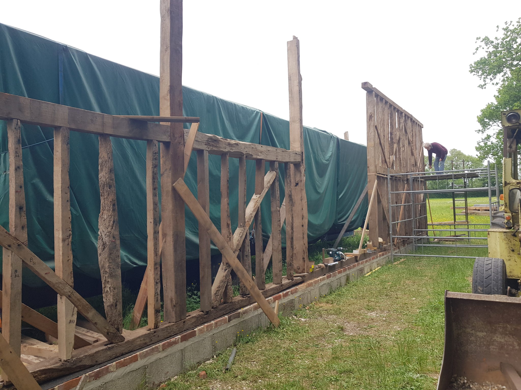 Maudies Carriage is now situated on our Montagues Farm site. Restoration is in progress! Currently the ancient barn frame that will house the Carriage is being re-constructed piece by piece. When the Ancient Essex Barn originally blew down in 1987 John had the foresight to label each piece and outline them on drawings ready for the day when it could be rebuilt. John and son Ben have been looking forward to this project and are hard at work on construction this summer.